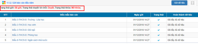 **Lưu ý: Tại cột Hoàn thành dữ liệu, người dùng có thể biết được đã hoàn thành đầy đủ các mẫu biểu báo cáo hay chưa.