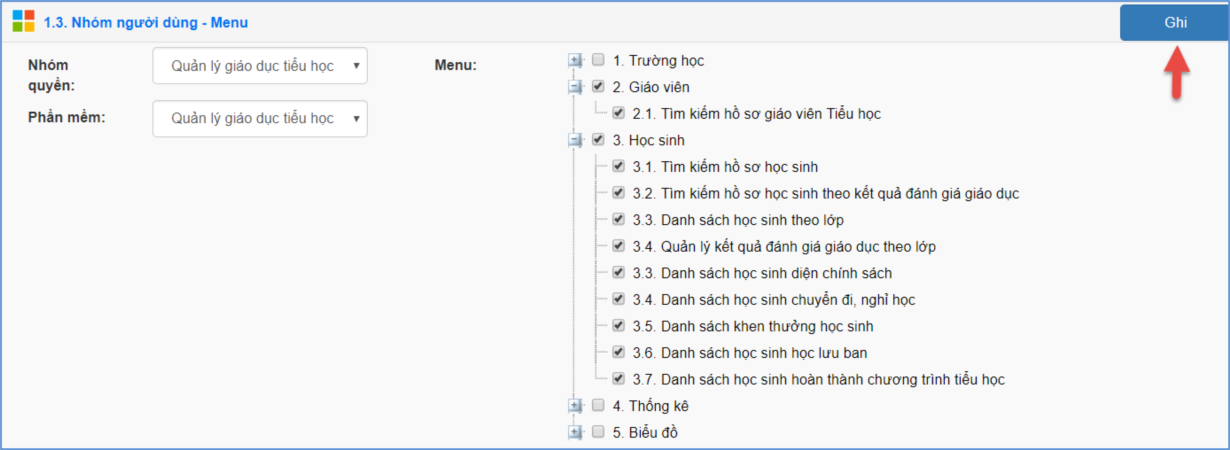 Mô tả: Chức năng này hỗ trợ Bộ GDĐT phân quyền từng chức năng chi tiết cho nhóm người dùng theo các menu có trên phần mềm.
