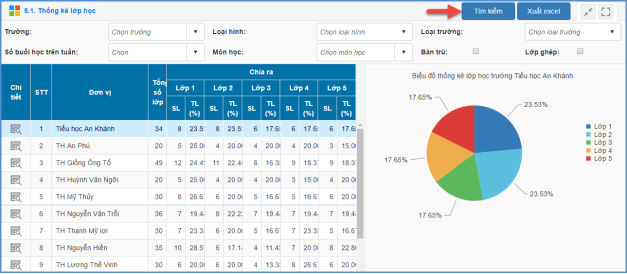 Mô tả: Chức năng này hỗ trợ Phòng GDĐT thống kê và xuất báo cáo về tỉ lệ lớp học của từng đơn vị trường học, loại hình trường thuộc Phòng GDĐT.