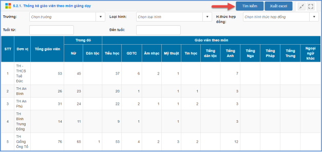 Mô tả: Chức năng này hỗ trợ Phòng GDĐT thống kê số lượng và tỉ lệ % giáo viên theo môn giảng dạy của từng đơn vị trường học thuộc Phòng GDĐT.