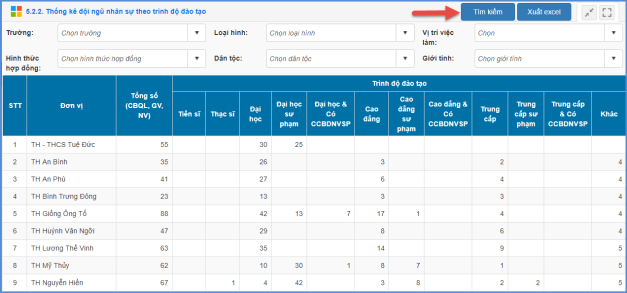 Mô tả: Chức năng này hỗ trợ Phòng GD&ĐT thống kê số lượng cán bộ quản lý, giáo viên, nhân viên chia theo trình độ đào tạo của trường Tiểu học.