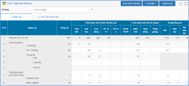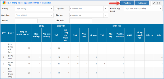 Mô tả: Chức năng này hỗ trợ Phòng GD&ĐT thống kê nhân sự trường Tiểu học theo vị trí việc làm.