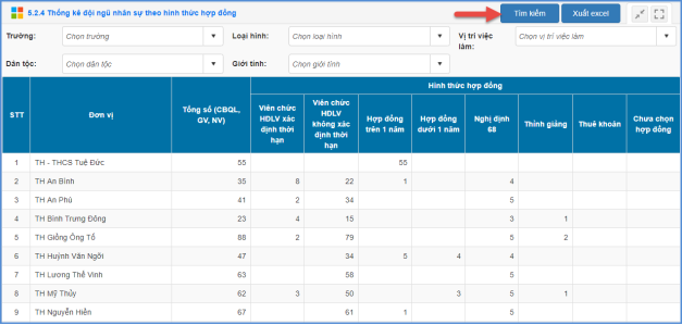Mô tả: Chức năng này hỗ trợ Phòng GD&ĐT thống kê nhân sự trường Tiểu học theo hình thức hợp đồng làm việc.