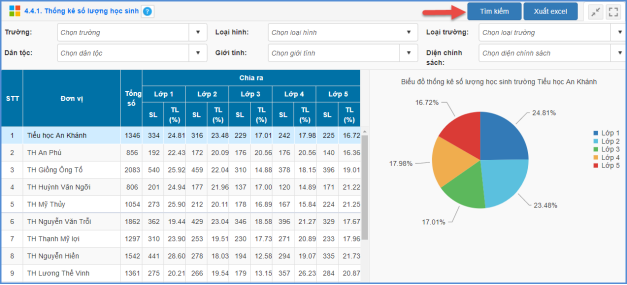 Mô tả: Chức năng này hỗ trợ Phòng GD&ĐT thống kê số lượng và tỉ lệ % học sinh các lớp theo độ tuổi của từng đơn vị trường Tiểu học.