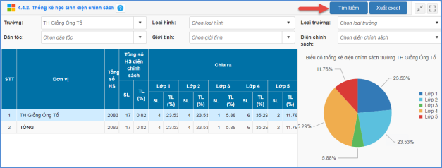 Mô tả: Chức năng này hỗ trợ Phòng GD&ĐT tìm kiếm và xuất báo cáo tổng hợp học sinh diện chính sách của các đơn vị trường Tiểu học.