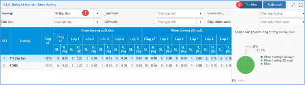 Mô tả: Chức năng này hỗ trợ Phòng GD&ĐT thống kê số lượng và tỉ lệ % học sinh khen thưởng cuối năm, khen thưởng đột xuất theo loại hình, loại trường của từng đơn vị trường học thuộc Phòng GD&ĐT.