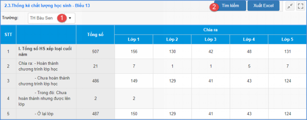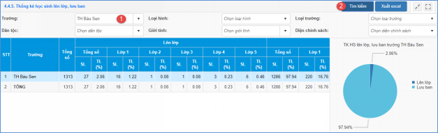 Mô tả: Chức năng này hỗ trợ Phòng GD&ĐT thống kê số lượng và tỉ lệ % học sinh lên lớp, lưu ban phân theo trường, loại hình, loại trường của từng đơn vị trường học thuộc Phòng GD&ĐT.