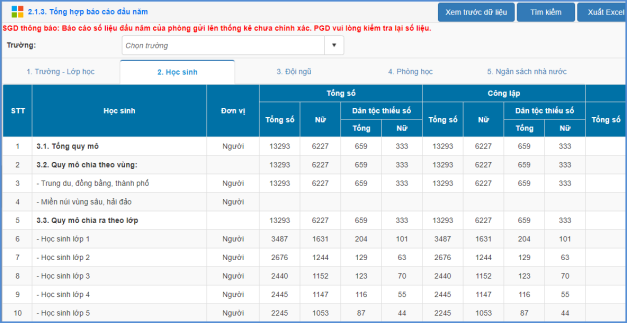 Mô tả: Chức năng này hỗ trợ Phòng GDĐT thống kê nhân sự, điểm trường CSVC, trường lớp, học sinh đầu năm.