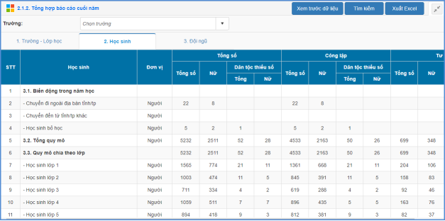 Mô tả: Chức năng này hỗ trợ Phòng GD&ĐT thống kê giáo dục tiểu học cuối năm về số lượng lớp học và học sinh trong từng lớp, đặc điểm chất lượng của học sinh, thống kê đội ngũ cán bộ, giáo viên và nhân viên các trường, thông tin về cơ sở vật chất như phòng học, thiết bị, sân chơi.