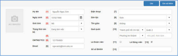 - Quê quán: Cho phép cập nhật tuần tự từ Tỉnh/Thành phố, Quận/huyện, Phường/Xã, địa chỉ. Sau khi chọn Tỉnh/Thành phố thì Quận/huyện thuộc Tỉnh sẽ hiển thị tương ứng.