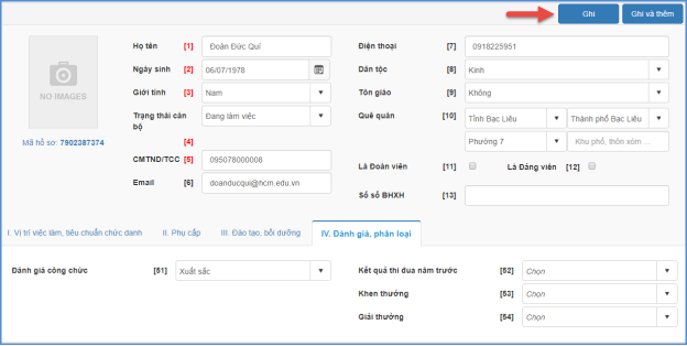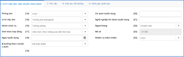 Bước 3: Nhập các thông tin hồ sơ nhân sự như: Vị trí việc làm, tiêu chuẩn chức danh, Phụ cấp, Đào tạo bồi dưỡng, Đánh giá, phân loại