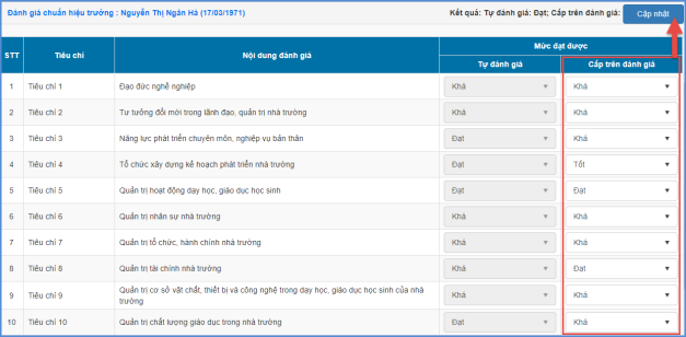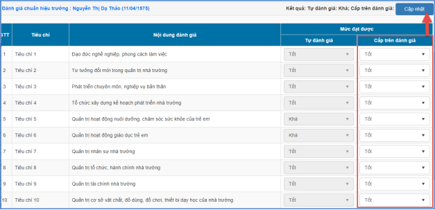 Bước 3: Tại Cấp trên đánh giá, chọn kết quả đánh giá theo từng tiêu chí