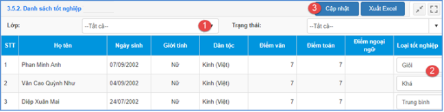 Mô tả: Chức năng này hỗ trợ nhà trường cập nhật loại tốt nghiệp cho học sinh tốt nghiệp THPT.