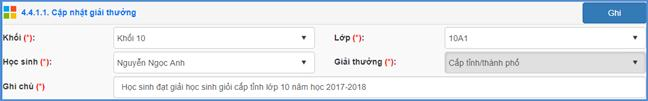 Bước 3: Chọn các thông tin về học sinh, giải thưởng, nhập ghi chú (nếu có) và kích nút [Cập nhật].