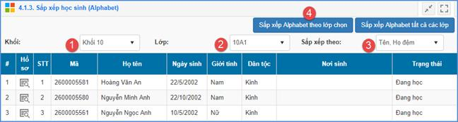 Bước 1: Tại phần mềm Quản lý giáo dục THPT. Kích vào danh mục 4. Học sinh/ 4.1 Hồ sơ học sinh/ 4.1.3 Sắp xếp học sinh (Alphabet).