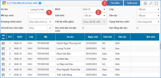 Mô tả: Chức năng này hỗ trợ nhà trường tìm kiếm hồ sơ học sinh dựa theo 1 số thông tin như: Họ tên, mã học sinh, đối tượng chính sách,...