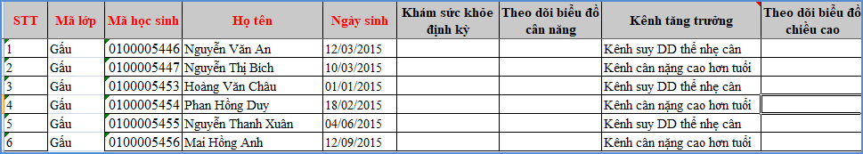 Bước 3: Nhập đầy đủ thông tin kết quả nuôi dưỡng của học sinh các lớp vào các cột trên file excel, đặc biệt các cột có màu đỏ là những thông tin bắt buộc phải nhập.