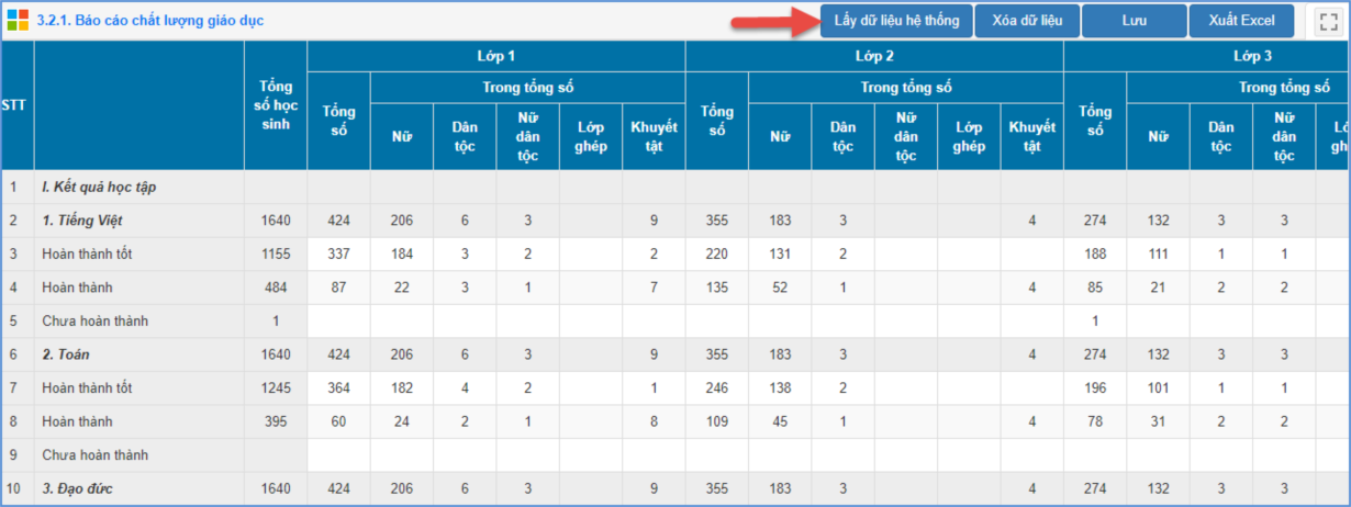Bước 2: Kích nút [Lấy dữ liệu hệ thống] để hệ thống tổng hợp số liệu từ dữ liệu đã nhập trong phần mềm Quản lý giáo dục Tiểu học