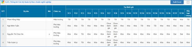 Mô tả: Chức năng này hỗ trợ nhà trường thống kê cán bộ quản lý theo đánh giá chuẩn nghề nghệp, thống kê xếp loại chung theo hình thức tự đánh giá và đánh giá cấp trên.