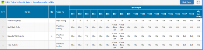 Mô tả: Chức năng này hỗ trợ nhà trường thống kê cán bộ quản lý theo đánh giá chuẩn nghề nghệp, thống kê xếp loại chung theo hình thức tự đánh giá và đánh giá cấp trên.