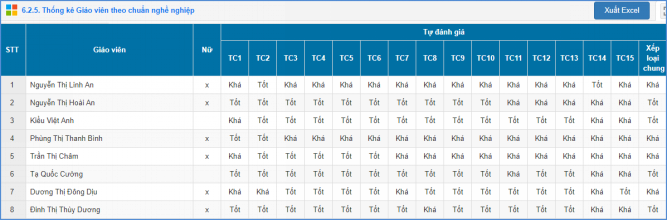 Mô tả: Chức năng này hỗ trợ nhà trường thống kê giáo viên theo đánh giá chuẩn nghề nghệp, thống kê xếp loại chung theo hình thức tự đánh giá và đánh giá cấp trên.