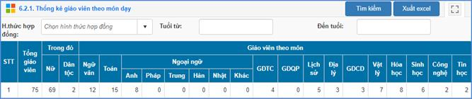 Mô tả: Chức năng này hỗ trợ nhà trường thống kê số lượng giáo viên toàn trường theo từng môn dạy.