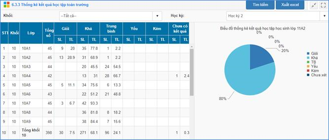 Mô tả: Chức năng này hỗ trợ nhà trường thống kê số lượng, tỷ lệ % vể kết quả học tập của học sinh toàn trường theo từng khối, từng lớp.