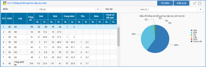 Mô tả: Chức năng này hỗ trợ nhà trường thống kê số lượng, tỷ lệ % vể kết quả học tập của học sinh toàn trường theo từng khối, từng lớp.