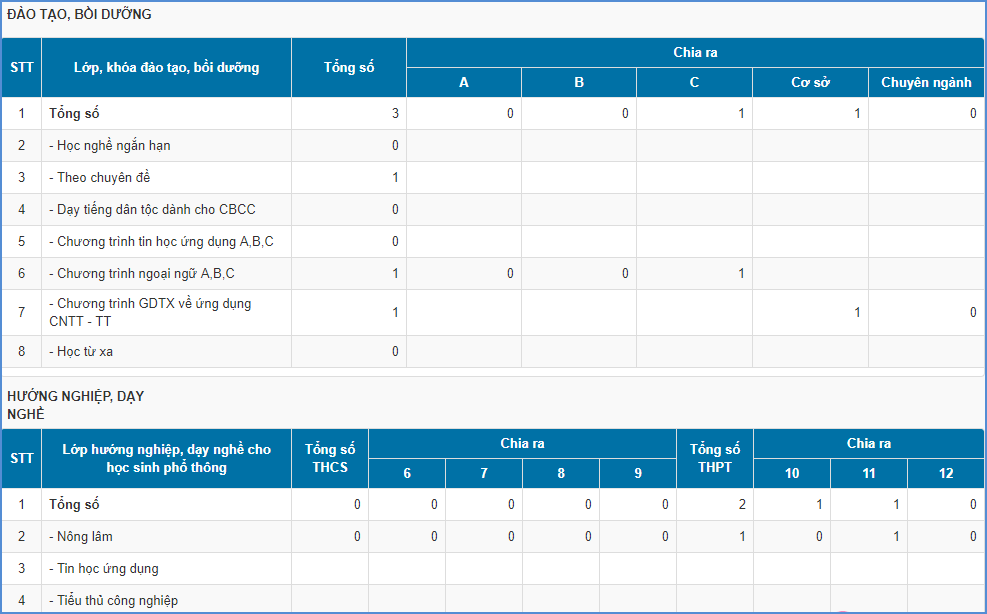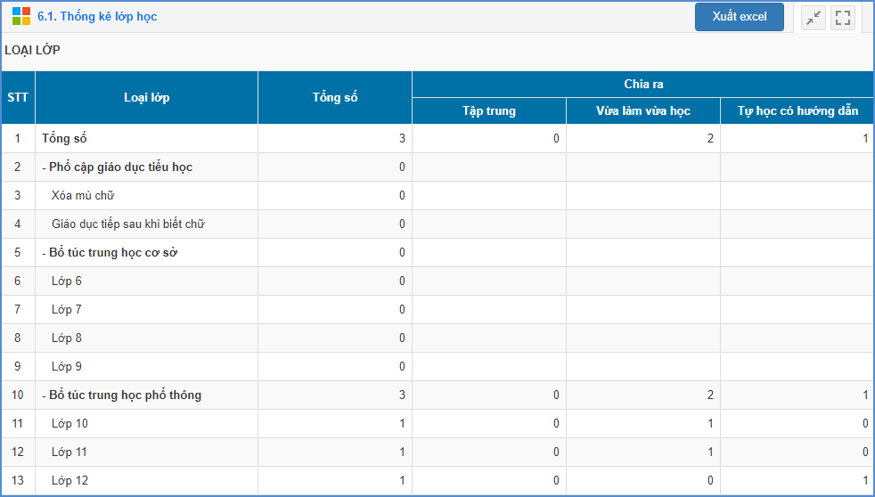 Mô tả: Chức năng này giúp TT GDTX thống kê lớp học đã nhập trên phần mềm theo các tiêu chí: Loại lớp, đào tạo bồi dưỡng, hướng nghiệp dạy nghề.