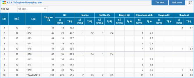 Mô tả: Chức năng này hỗ trợ nhà trường thống kê số lượng học sinh theo từng khối, từng lớp.