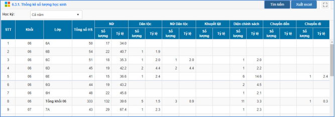 Mô tả: Chức năng này hỗ trợ nhà trường thống kê số lượng học sinh theo từng khối, từng lớp.