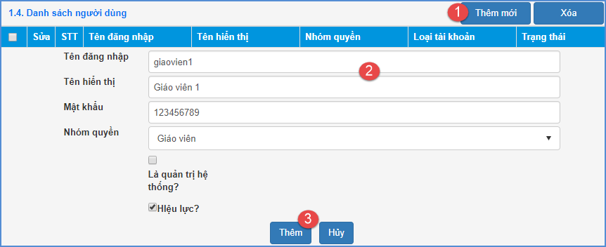 Bước 2: Kích nút [Thêm mới], nhập đầy đủ thông tin người dùng: Tên đăng nhập, tên hiển thị, mật khẩu, nhóm quyền,…